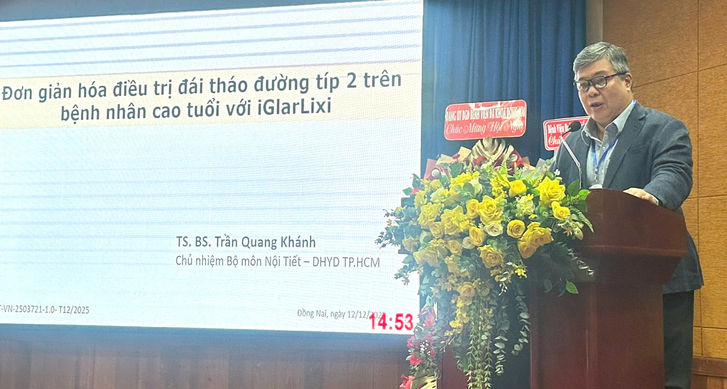 TS.BS Trần Quang Khánh, Trưởng Bộ môn Nội tiết, Đại học Y Dược Thành phố Hồ Chí Minh chia sẻ đề tài “Đơn giản hóa trong điều trị đái tháo đường type 2 ở bệnh nhân cao tuổi với iGlarlixi” tại hội nghị.