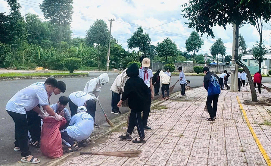 Học sinh trường THCS Tân Thiện phường Bình Phước, tỉnh Đồng Nai tham gia dọn dẹp vệ sinh môi trường, góp phần cải thiện cảnh quan đô thị và hạn chế nguy cơ phát sinh mầm bệnh trong cộng đồng.