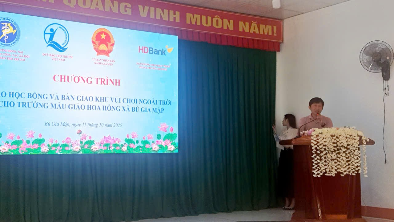 Được sự quan tâm của Quỹ Bảo trợ trẻ em Việt Nam, đã vận động Ngân hàng HDBank tài trợ cho các trẻ em có hoàn cảnh khó khăn trên địa bàn tỉnh Đồng Nai. Theo đó Ngân hàng HDBank đã trao 240 suất học bổng bằng tiền mặt cho học sinh nghèo vượt khó, có ý chí vươn lên trong học tập và khu vui chơi ngoài trời cho tỉnh Đồng Nai, trong đó xã Bù Gia Mập được trao tặng 23 suất học bổng và 01 khu vui chơi ngoài trời cho trường mầm non Hoa Hồng. Khu vui chơi ngoài trời gồm các thiết bị vận động, đồ chơi phát triển thể chất và trí tuệ phù hợp với lứa tuổi mầm non, giúp các em có thêm sân chơi lành mạnh, an toàn.