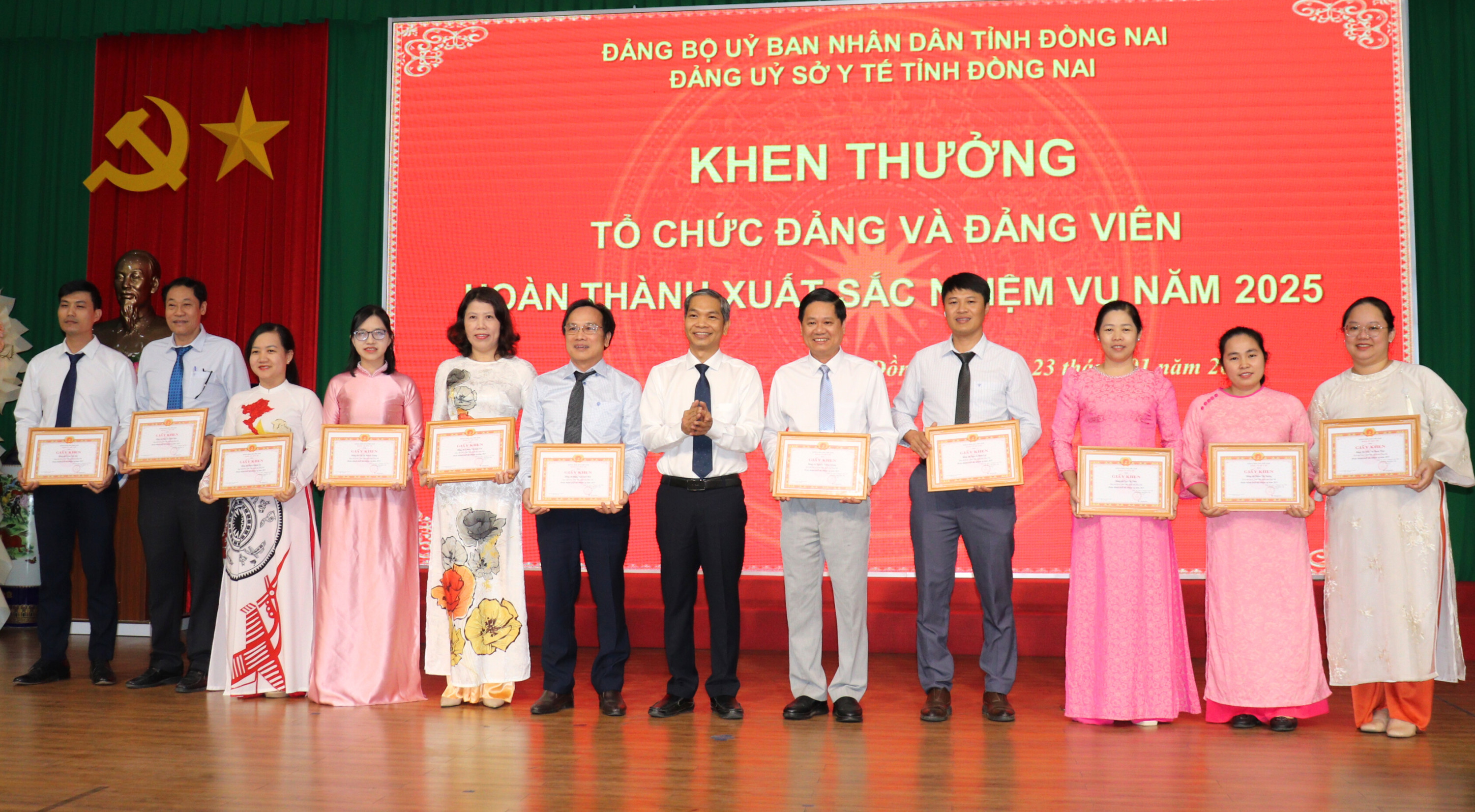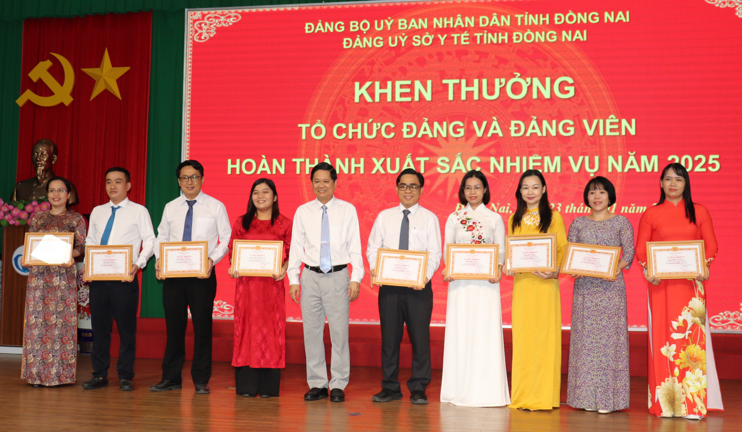 Phó Bí thư Đảng bộ bộ phận bệnh viện ĐK Thống Nhất Lâm Hùng Hạnh trao giấy khen cho các cá nhân hoàn thành xuất sắc nhiệm vụ trong năm 2025.